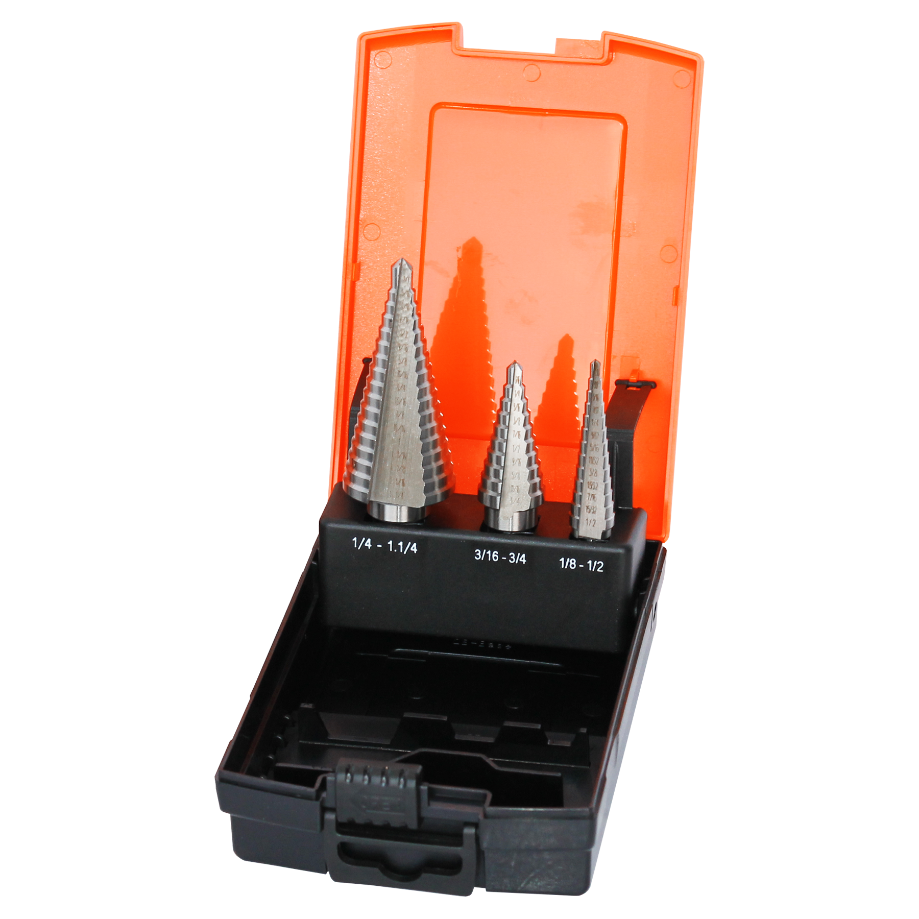 3Pc Sae Step Drill Set • 3/16"- 1/2" 1/4"- 3/4" & 1/8"- 1/2". • Made From High Quality Hss Steel. • Titanium Coated To Reduce Friction And Heat. • Drills Perfectly Round Holes In Steel Brass Plastic Wood Etc.