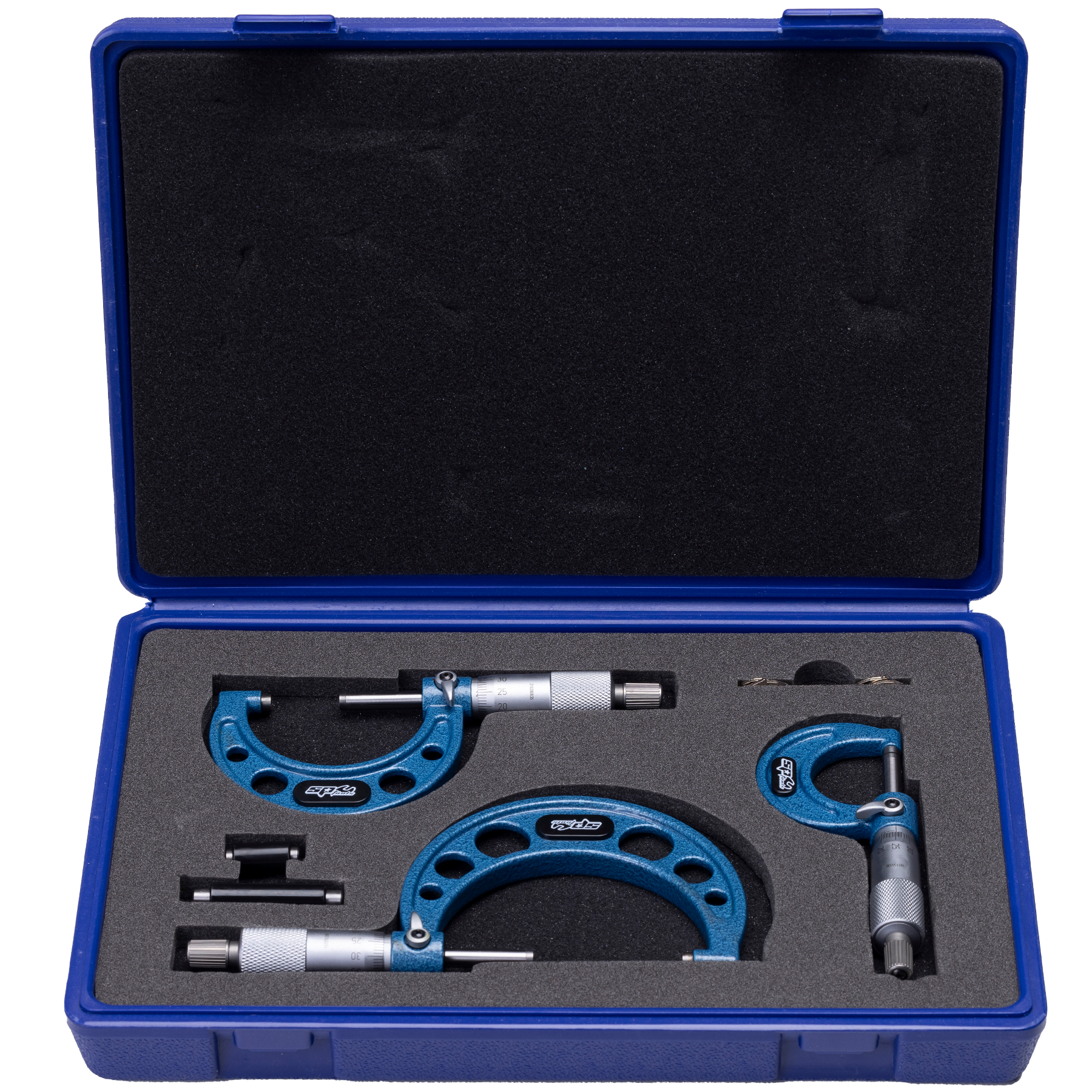 3Pc Outside Micrometer Set • Includes 0-25mm, 25-50mm & 50-75mm Micrometers • Graduation: 0.01mm • Setting Gauge Including Ratchet Stop