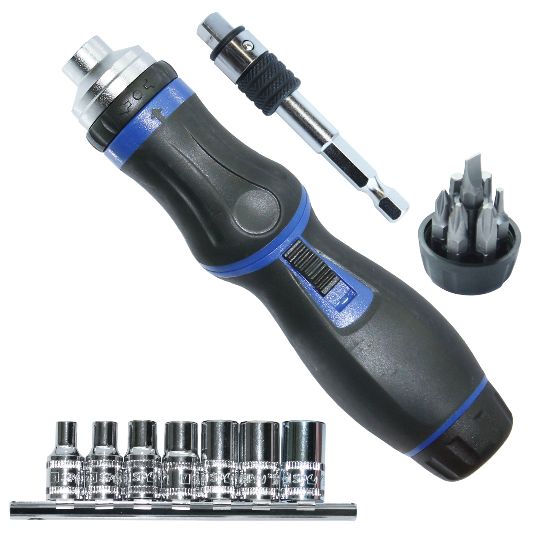 1/4” Bit & Socket Set & 2-In 1 Rotatable Ratchet Driver - 16Pc 90° Rotatable Ratchet Driver • Head Swivels And Locks To 90° For Hard To Reach Applications • On-Board Storage Of Bits • Removable Socket-To-Bit Adapter Bits Included: 7Pc • Phillips Bits - Ph1, Ph2, Ph3 • Hexagon Bits - 4mm • Slotted Bits – 6mm • Torx Bits – T10, T30 Sockets Included: 7Pc • 1/4”Dr. Socket Rail (6Pt) - 4, 5, 6, 7, 8, 9, 10mm Feature Swap Between Using Sockets And Bits Quickly Adapter Quickly Converts To 1/4” Squaredrive Or 1/4” Hex For Quick And Effortless Changes Between Sockets And Bits.