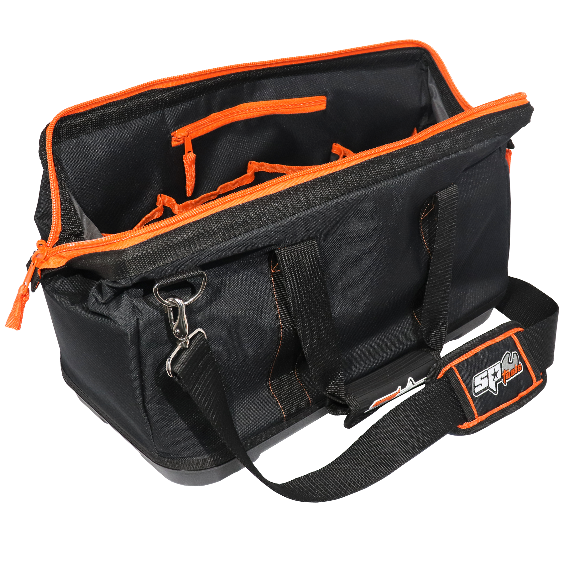 Open Mouth Bag • Size (580W X 540D X 380H) • Semi-Rigid Construction Allows Wide Open Mouth To Maintain Shape • Easy Access Pockets And Compartments For Your Storage Needs • Heavy Duty Fabric & Moulded Waterproof Base For Long Lasting Durability. • Padded Shoulder Strap Is Removable & Adjustable • Moulded Rubber Handle Provides A Slip-Resistant Grip • Moulded Waterproof Base