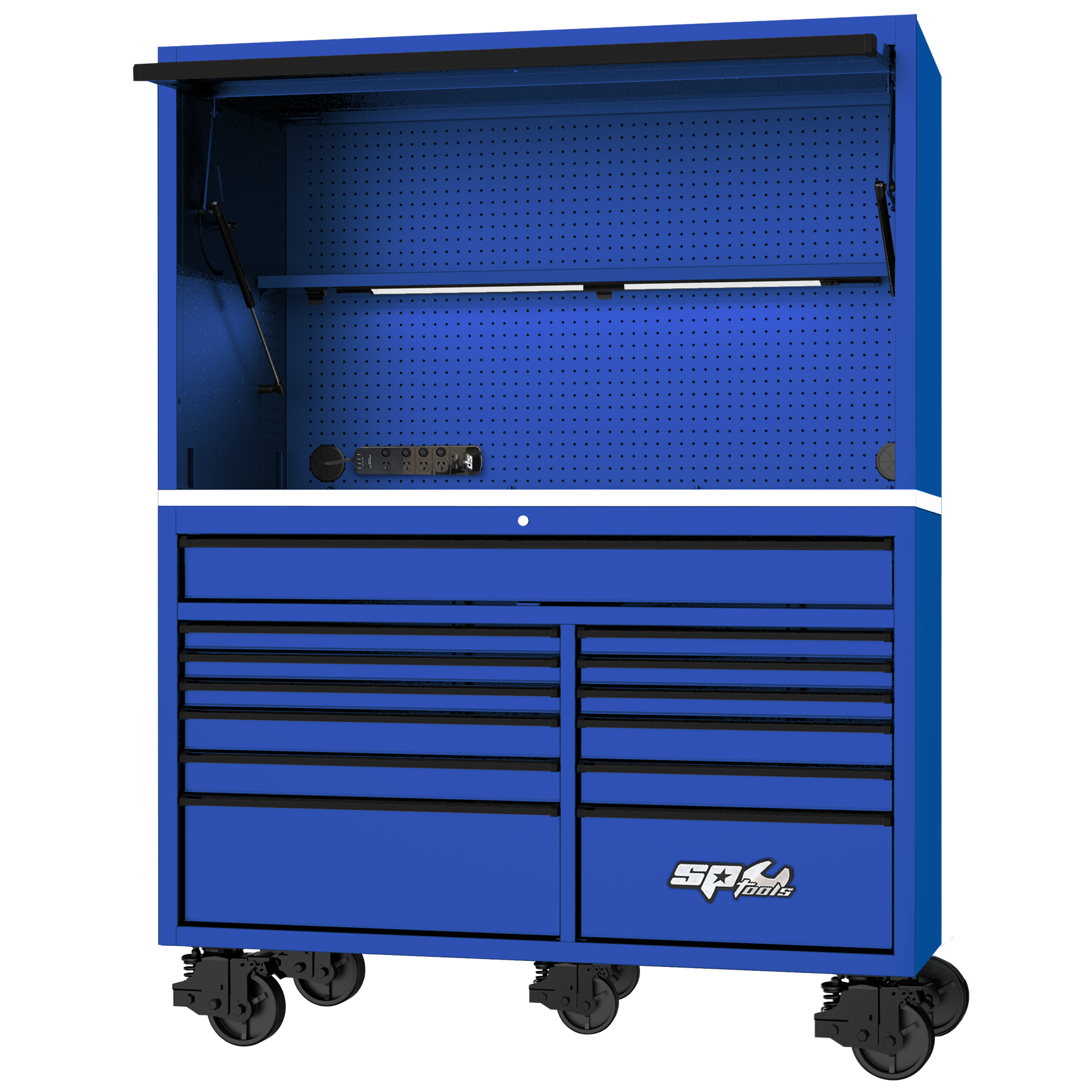 SP Tools - Workstation - Usa Series 59" Blue/Black | SP44740BL Key Features 59" Usa Sumo Series Power Top Hutch • Steel Pegboard Rear Wall To Organise Frequently Used Tools • 2 Built-In 600mm Led Lights • Includes... Read More