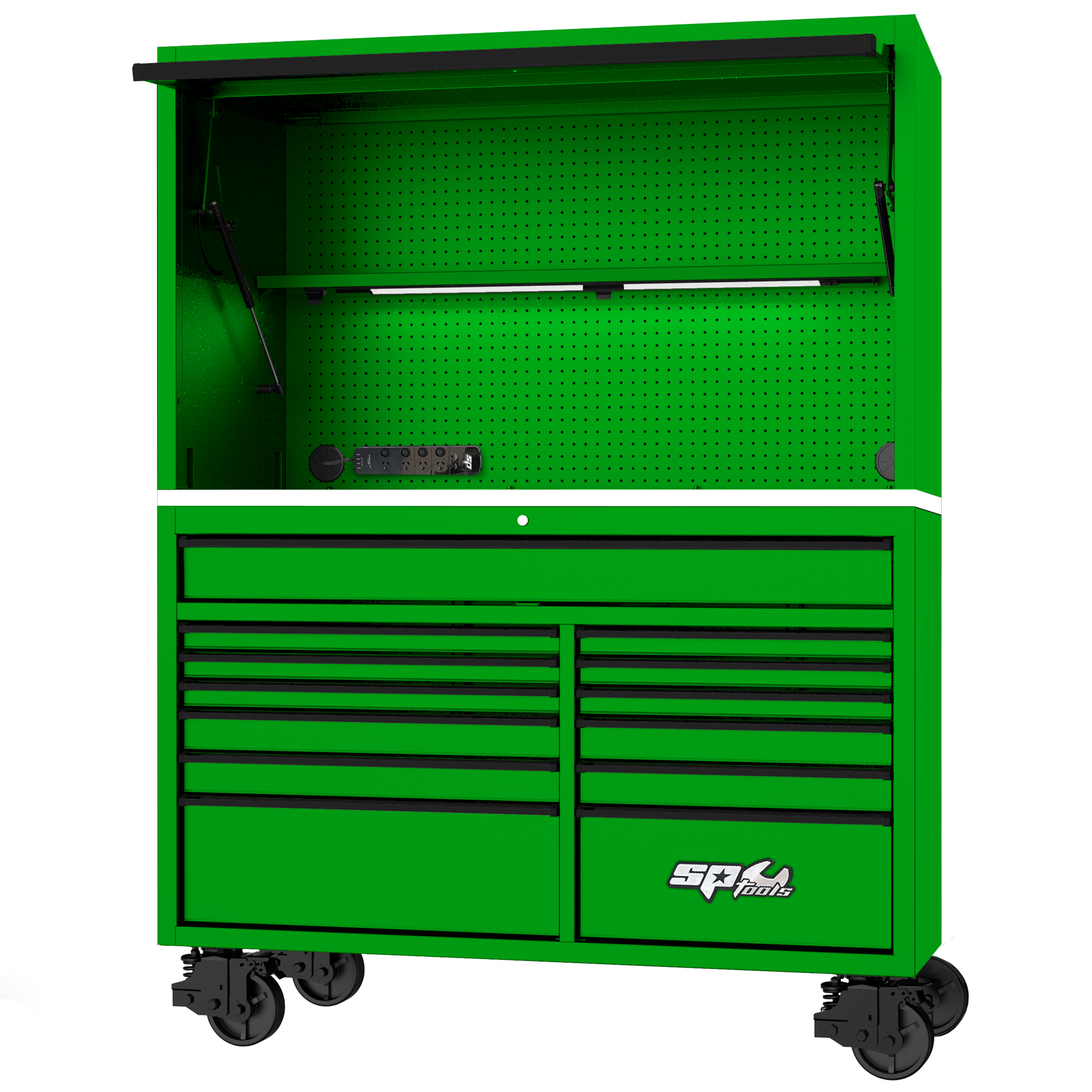 SP Tools - Workstation - Usa Series 59" Green/Black | SP44740G Key Features 59" Usa Sumo Series Power Top Hutch • Steel Pegboard Rear Wall To Organise Frequently Used Tools • 2 Built-In 600mm Led Lights • Includes... Read More