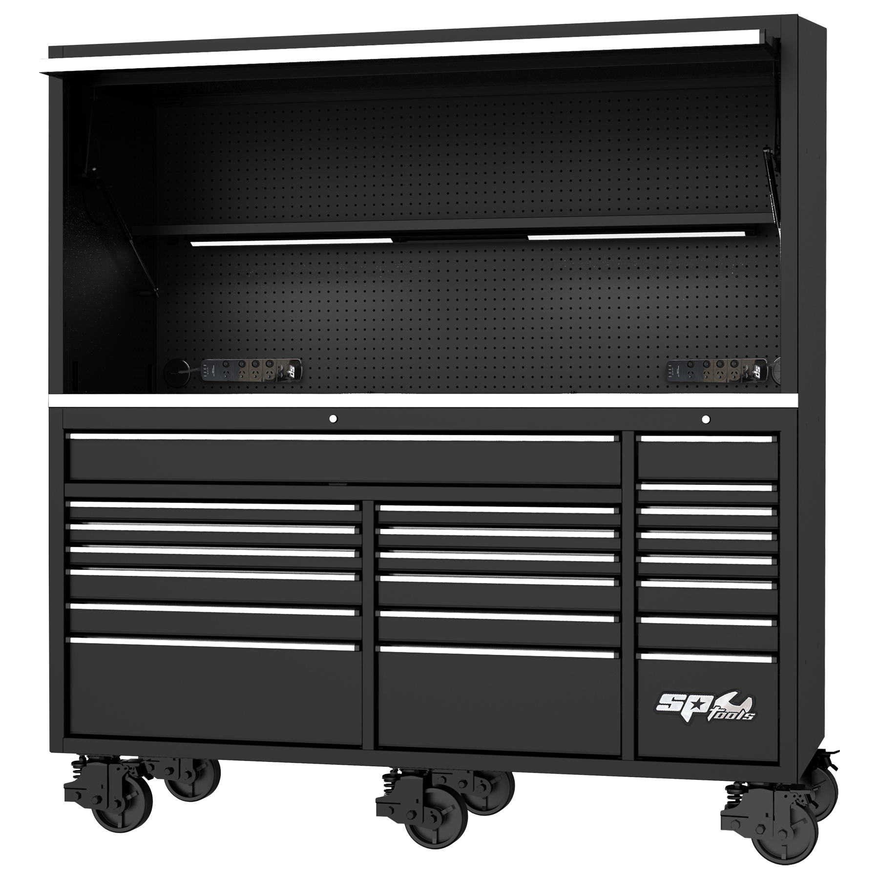 SP Tools - Workstation - Usa Series 79" Black | SP44840 Key Features 79"" Usa Sumo Series Power Top Hutch • Steel Pegboard Rear Wall To Organise Frequently Used Tools • 2 Built-In 600mm Led Lights • Includes... Read More