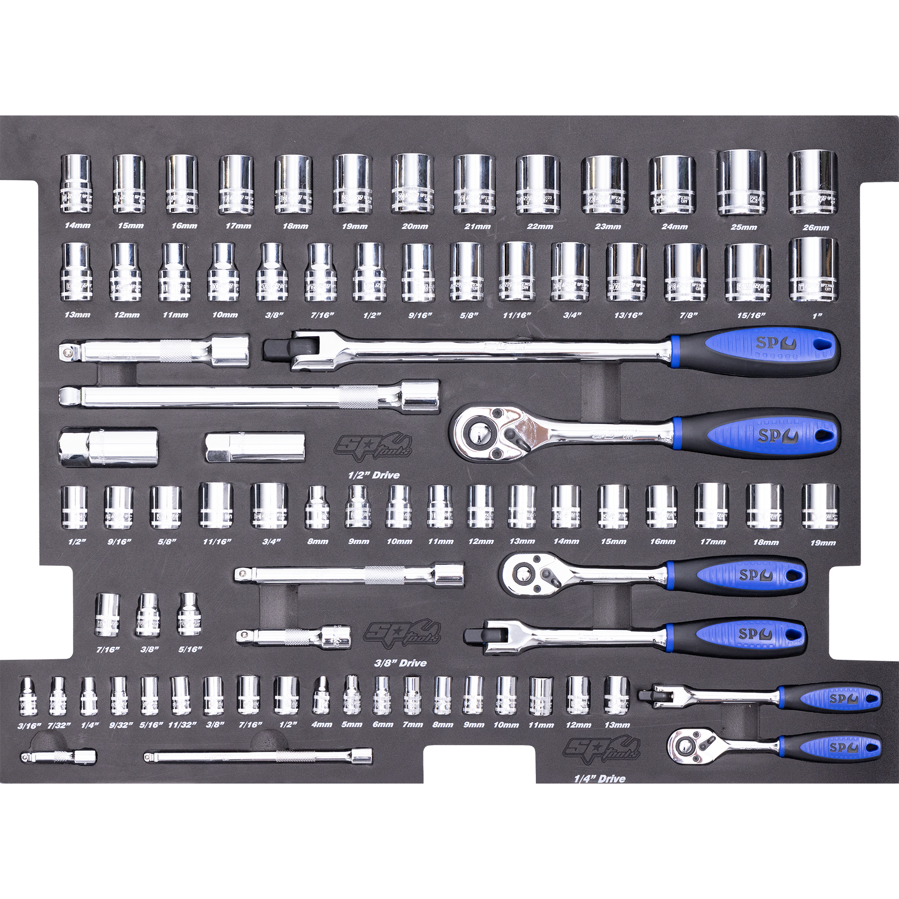 • 1/4”Dr Sockets & Accessories • 12Pt - 4 To 13mm • 12Pt - 3/16 To 1/2” • 45T Ratchet & Flex Handle • Wobble Extension Bars - 50 & 150mm 3/8”Dr Sockets & Accessories • 12Pt - 8 To 19mm • 12Pt - 5/16 To 3/4” • Spark Plug Sockets - 5/8 & 13/16” • 45T Ratchet & Flex Handle • Wobble Extension Bars - 75 & 150mm • Adaptors - 3/8Fx1/4M & 3/8Fx1/2M 1/2”Dr Sockets & Accessories • 12Pt - 10 To 26mm • 12Pt - 3/8 To 1” • 45T Ratchet & Flex Handle • Wobble Extension Bars - 125 & 250mm • Adaptor - 1/2Fx3/8M • Stored In High Density Eva Protective Foam