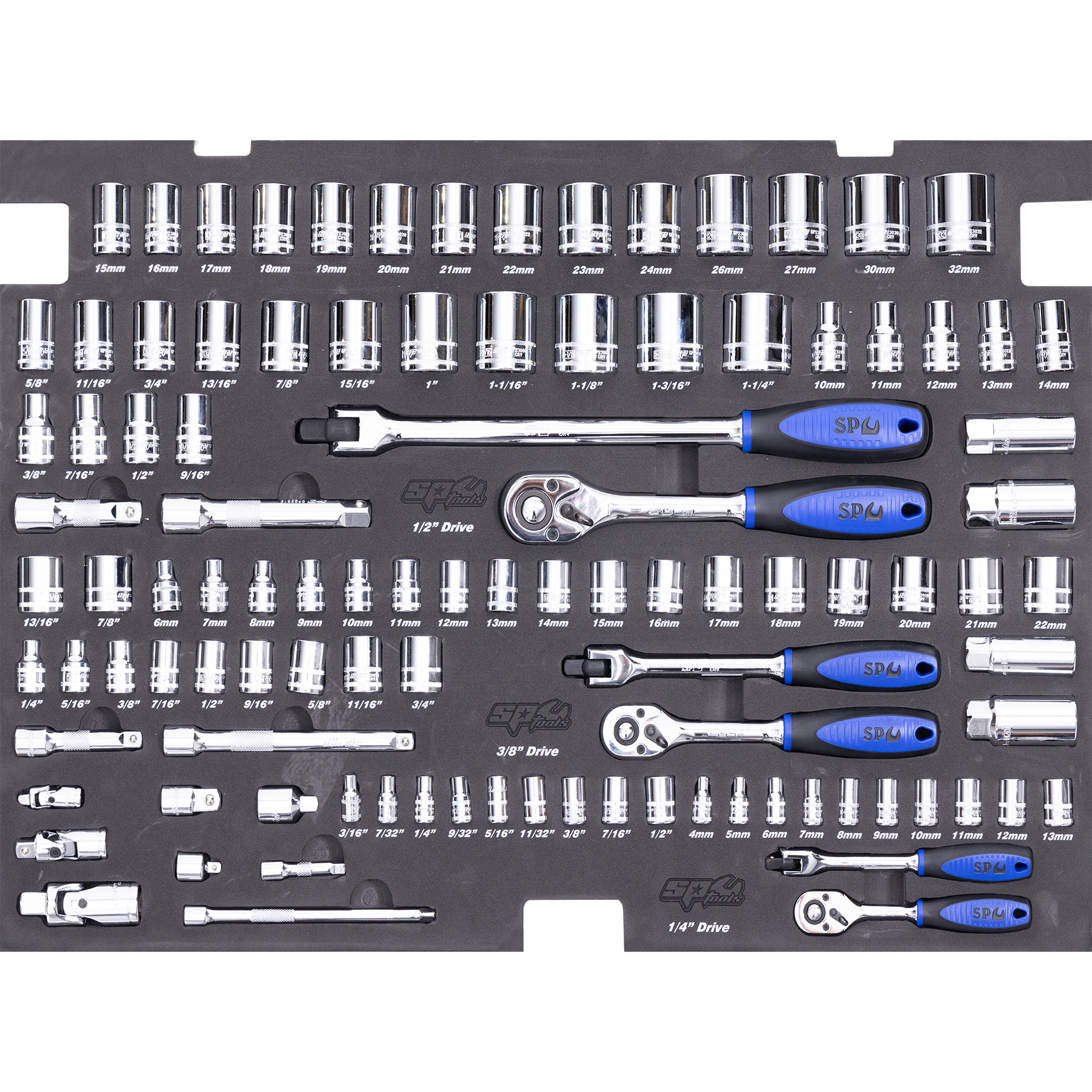 • 1/4”Dr Sockets & Accessories • 12Pt - 4 To 13mm • 12Pt - 3/16 To 1/2” • 45T Ratchet Flex Handle & Universal Joint • Extension Bars - 50 & 150mm 3/8”Dr Sockets & Accessories • 12Pt - 6 To 22mm • 12Pt - 1/4 To 7/8” • Spark Plug Sockets - 5/8 & 13/16” • 45T Ratchet Flex Handle & Universal Joint • Extension Bars - 75 & 150mm • Adaptors - 3/8Fx1/4M & 3/8Fx1/2M 1/2”Dr Sockets & Accessories • 12Pt - 10 To 32mm • 12Pt - 3/8 To 1-1/4” • 45T Ratchet Flex Handle & Universal Joint • Extension Bars - 75 & 125mm • Spark Plug Sockets - 5/8 & 13/16” • Adaptor - 1/2Fx3/8M • Stored In High Density Eva Protective Foam