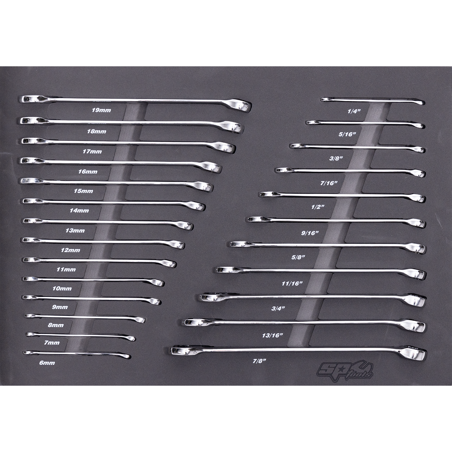 • Combination Spanners • 6, 7, 8, 9, 10, 11, 12, 13, 14, 15, 16, 17, 18 & 19mm • 1/4, 5/16, 3/8, 7/16, 1/2, 9/16, 5/8, 11/16, 3/4, 13/16 & 7/8 • Stored In High Density Eva Protective Foam • Chrome Vanadium Steel For High Durability. • Dual Flat Drive Technology On Ring End. • Tough Triple Chrome Finish To Protect Tool.