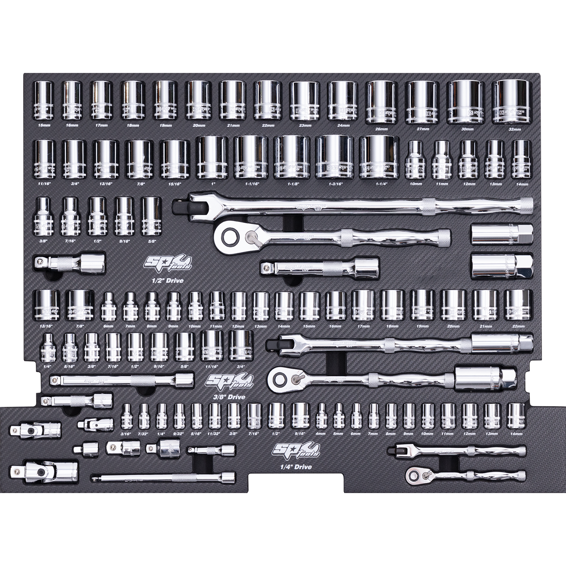 • Combination Quad Drive • 6, 7, 8, 9, 10, 11, 12, 13, 14, 15, 16, 17, 18 & 19mm • 1/4, 5/16, 3/8, 7/16, 1/2, 9/16, 5/8, 11/16, 3/4, 13/16 & 7/8” • Fits Into The Drawers In The Concept Series Range • Chrome Vanadium Steel For High Durability. • Tough Triple Chrome Finish To Protect Tool.