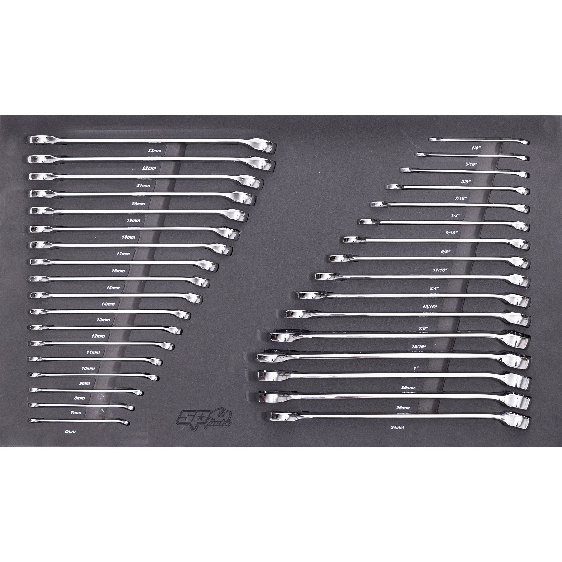 • Combination Spanners • 6, 7, 8, 9, 10, 11, 12, 13, 14, 15, 16, 17, 18, 19, 20, 21, 22, 23, 24, 25 & 26mm • 1/4, 5/16, 3/8, 7/16, 1/2, 9/16, 5/8, 11/16, 3/4, 13/16, 7/8, 15/16 & 1” • Stored In High Density Eva Protective Foam • Chrome Vanadium Steel For High Durability. • Dual Flat Drive Technology On Ring End. • Tough Triple Chrome Finish To Protect Tool
