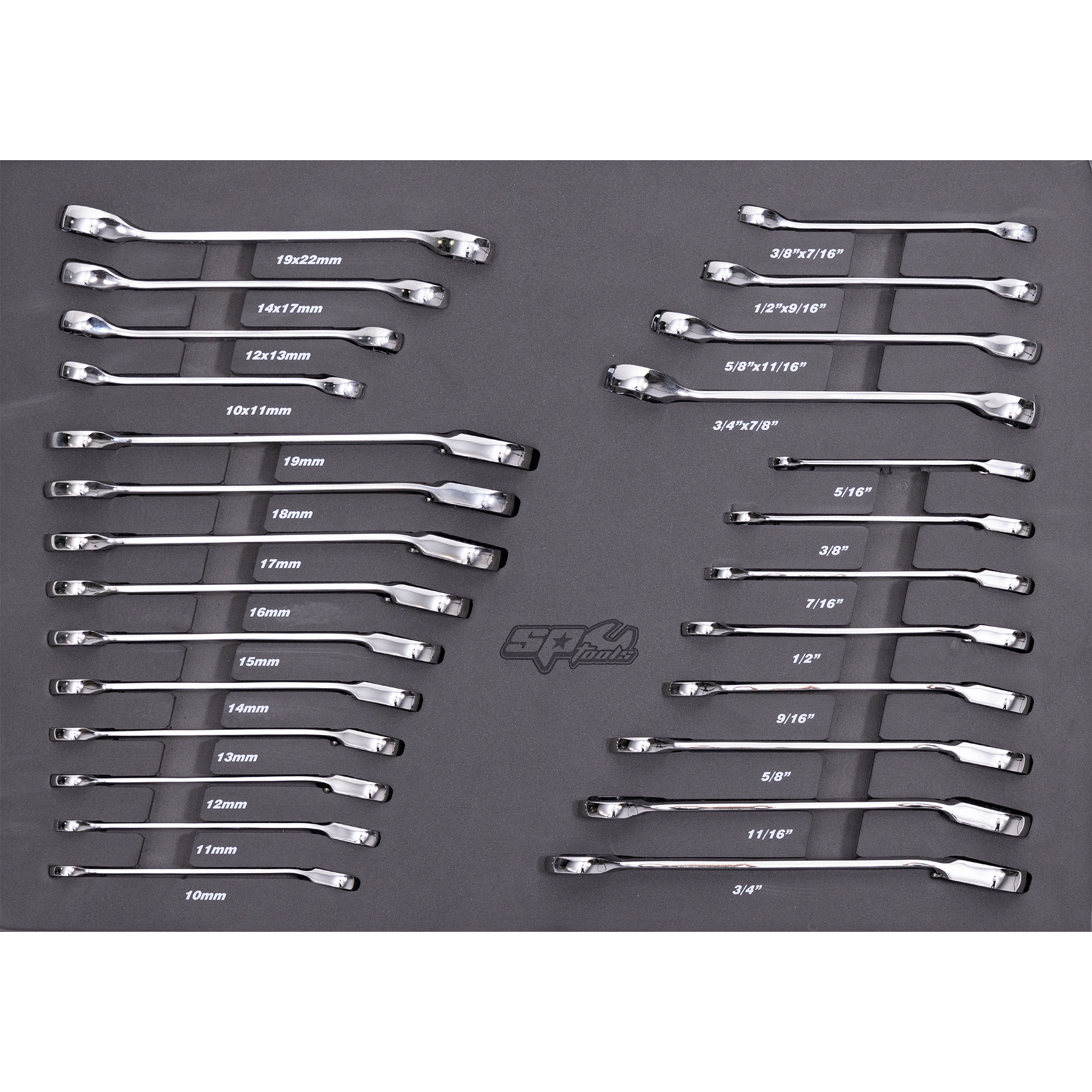 • 26Pc Metric/Sae Flare & Geardrive Spanner Set •Flare: 10 To 22mm & 3/8 To 7/8”• Geardrive: 10 To 19mm & 5/16 To 3/4” • Eva Hi-Density Foam Tool Storage Offers Extra Protection For Your Sp Tools • To Suit Most Custom & Concept Sp Tool Boxes • Size 550mm X 390mm