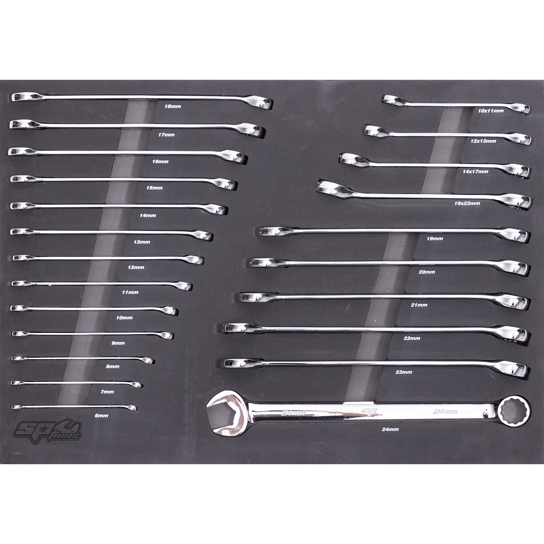 • Combination • 6, 7, 8, 9, 10, 11, 12, 13, 14, 15, 16, 17, 18, 19, 20, 21, 22, 23, & 24mm Flare Nut • 10X11mm 12X13mm 14X17mm & 19X22mm • Stored In High Density Eva Protective Foam • Chrome Vanadium Steel For High Durability. • Tough Triple Chrome Finish To Protect Tool.