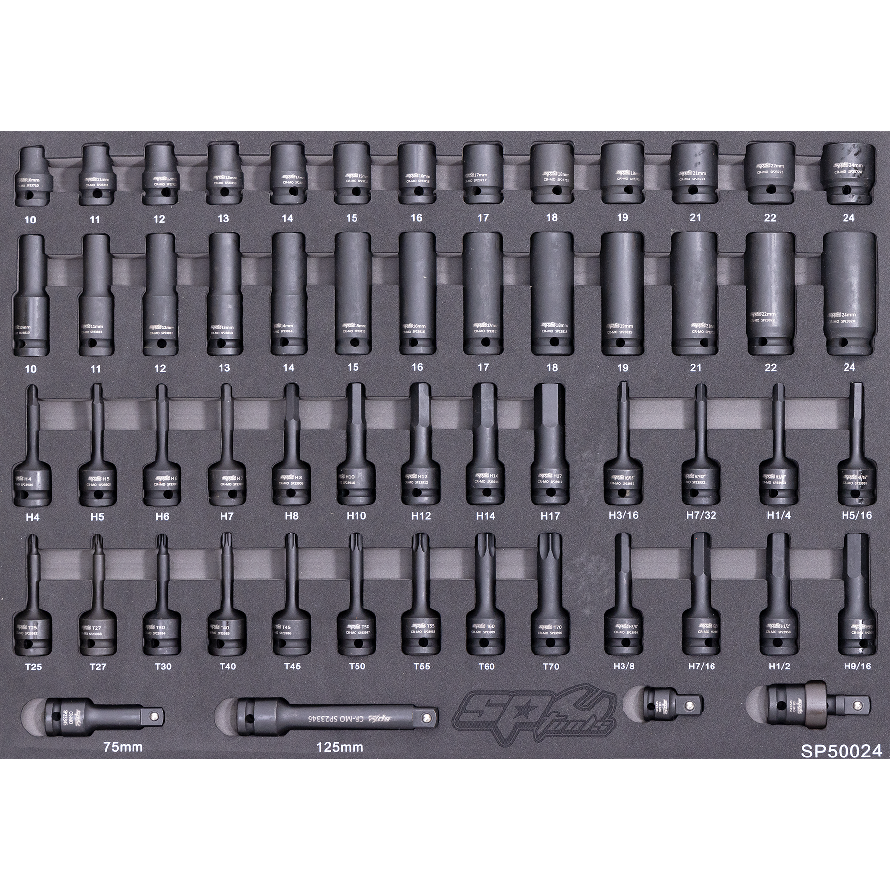 Eva Foam Tray 1/2"Dr Impact Sockets & Accessories 56 Piece1/2”Dr Impact Sockets & Accessories • Impact 6Pt - 10 11 12 13 14 15 17 18 19 21 22 & 24mm • Impact 6Pt Deep - 10 11 12 13 14 15 17 18 19 21 22 & 24mm • Impact Inhex - 4 5 6 7 8 10 12 14 & 17mm • Impact Inhex - 3/16 7/32 1/4 5/16 3/8 7/16 1/2 & 9/16” • Impact Torx - T25 T27 T30 T40 T45 T50 T55 T60 & T70 • Impact Universal Joint • Impact Extension Bars - 75 & 125mm • Imapct Adaptor - 3/8”F X 1/2”M