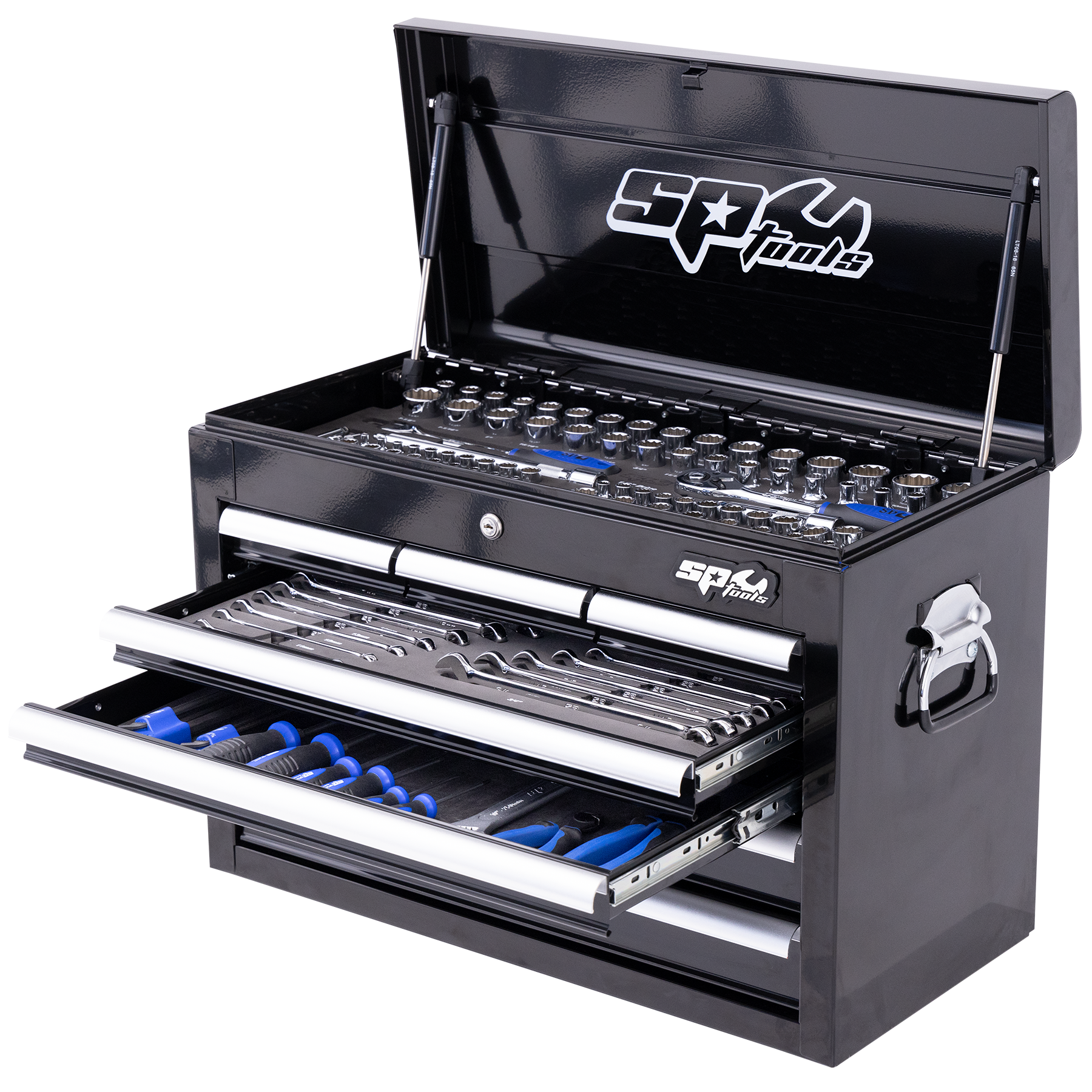 134Pc Metric/Sae Custom Series Tool Kit • Roe Combination Spanners • 1/4”, 3/8” & 1/2” Dr Sockets & Accessories • Combination Pliers & Diagonal Cutters • Adjustable Wrench • Adaptors • Hammer • Hex Keys • Screwdrivers • Wobble Extension Bars • 7 Drawer Tool Box