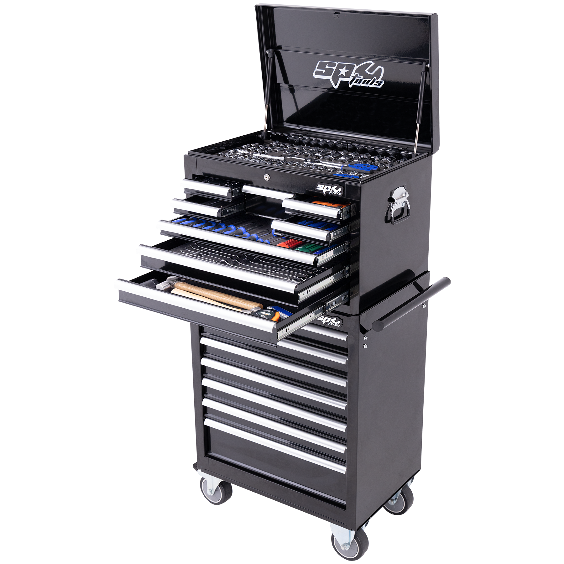 303Pc Metric/Sae Custom Series Tool Kit • All Sockets, Socket Accessories And Roe Spanner Come In Hi-Density Foam Storage System. • Maxi Drawers Featuring 405mm Depth • 1/4”, 3/8” & 1/2”Dr Sockets & Accessories • Metric & Sae Roe Spanners • Metric & Sae Flare Nut Spanners • Screwdriver & Hex Key Sets • Pliers & Cutters • Multigrips & Hammers • Hacksaw & Tape Measure • Pick Set • Pry Bar Set • 8 Drawer Tool Box • 7 Drawer Roller Cabinet