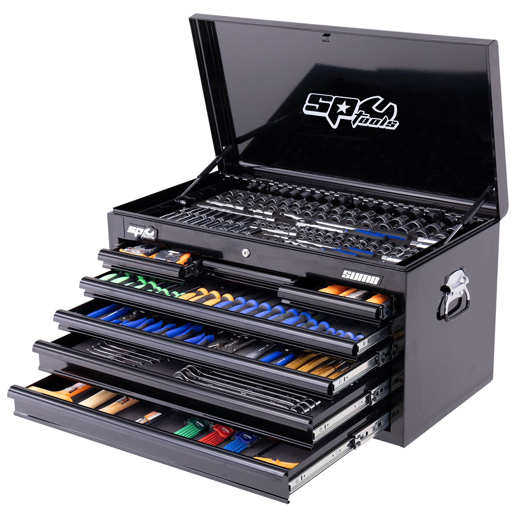 409Pc Metric/Sae Tool Kit In Sumo Series Tool Box • 6 - 26mm & 1/4” - 1” Roe Spanners • 1/4”, 3/8” & 1/2” Dr Sockets & Accessories • Screwdrivers • Pliers & Cutters • Adjustable Wrench • Hex & Torx Keys • Hammer • Foldback Knife • Pick Up Tool • Inspection Mirror • Magnetic Parts Tray • Circuit Tester • Multimeter • Pick Set, Tweezer Set & Pry Bar Set • Tape Measure • Screw Extractor Set • 7 Drawer Custom Sumo Series Tool Box