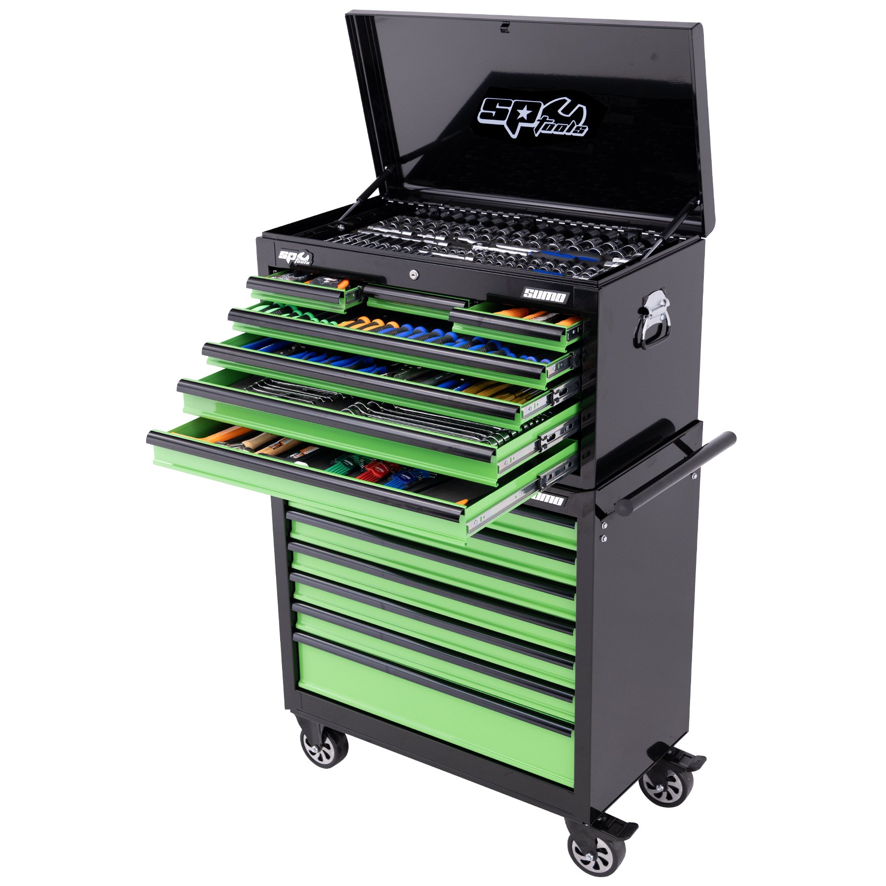 417Pc Metric/Sae Sumo Series Tool Kit (Black/Green) 1390 (H) X 460 (D) X 955 (W) • 6 - 26mm & 1/4” - 1” Roe Spanners • 1/4”, 3/8” & 1/2” Dr Sockets & Accessories • Screwdrivers • Pliers & Cutters • Adjustable Wrench • Pick Up Tool • Inspection Mirror • Hex & Torx Keys • Hammer & Foldback Knife • Magnetic Parts Tray • Circuit Tester & Multimeter • Pick Set & Tape Measure • Screw Extractor Set • 7 Drawer Sumo Tool Box • 7 Drawer Sumo Roller Cabinet