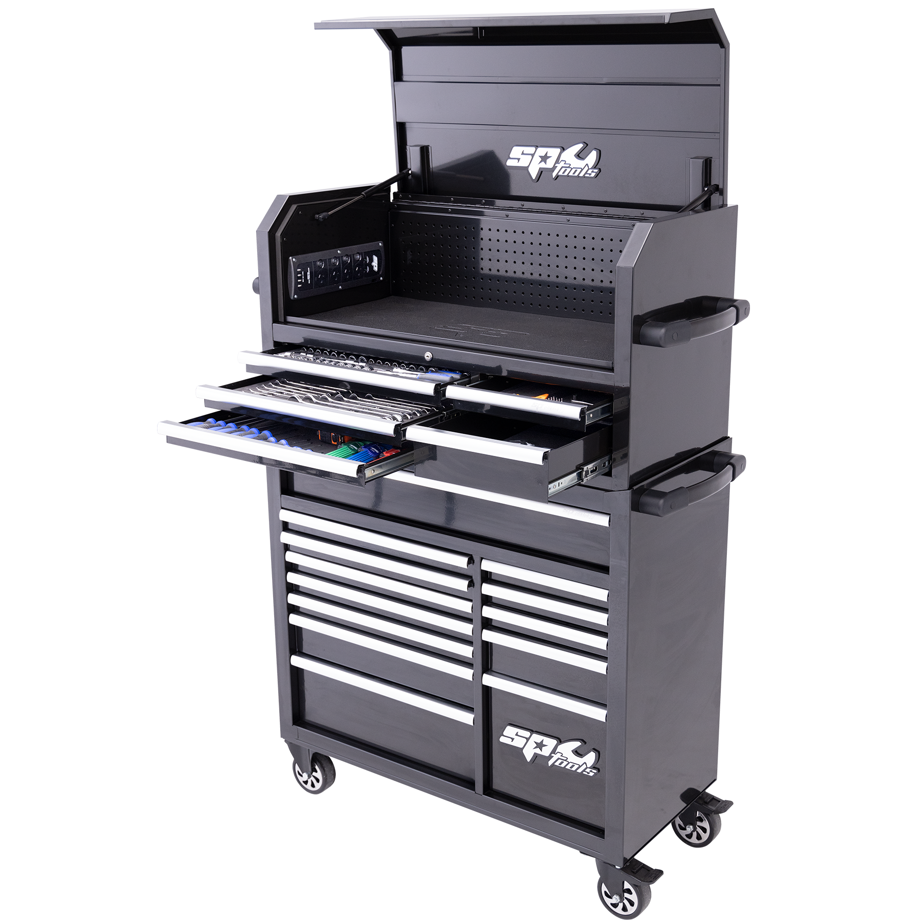 305Pc Metric/Sae Sumo Series Power Hutch Tool Kit (1226W X 1610H X 480D) • Roe Spanners • 1/4”, 3/8” & 1/2”Dr Sockets & Accessories • Screwdrivers • Pliers & Cutters • Hex & Torx Keys • Adjustable Wrenches • Hammer & Hacksaw • Tape Measure • Punch & Chisel Set • 6X Tool Storage Trays • 5 Drawer Sumo Hutch • 13 Drawer Sumo Roller Cab. - Built-In 4 Outlet Power Board