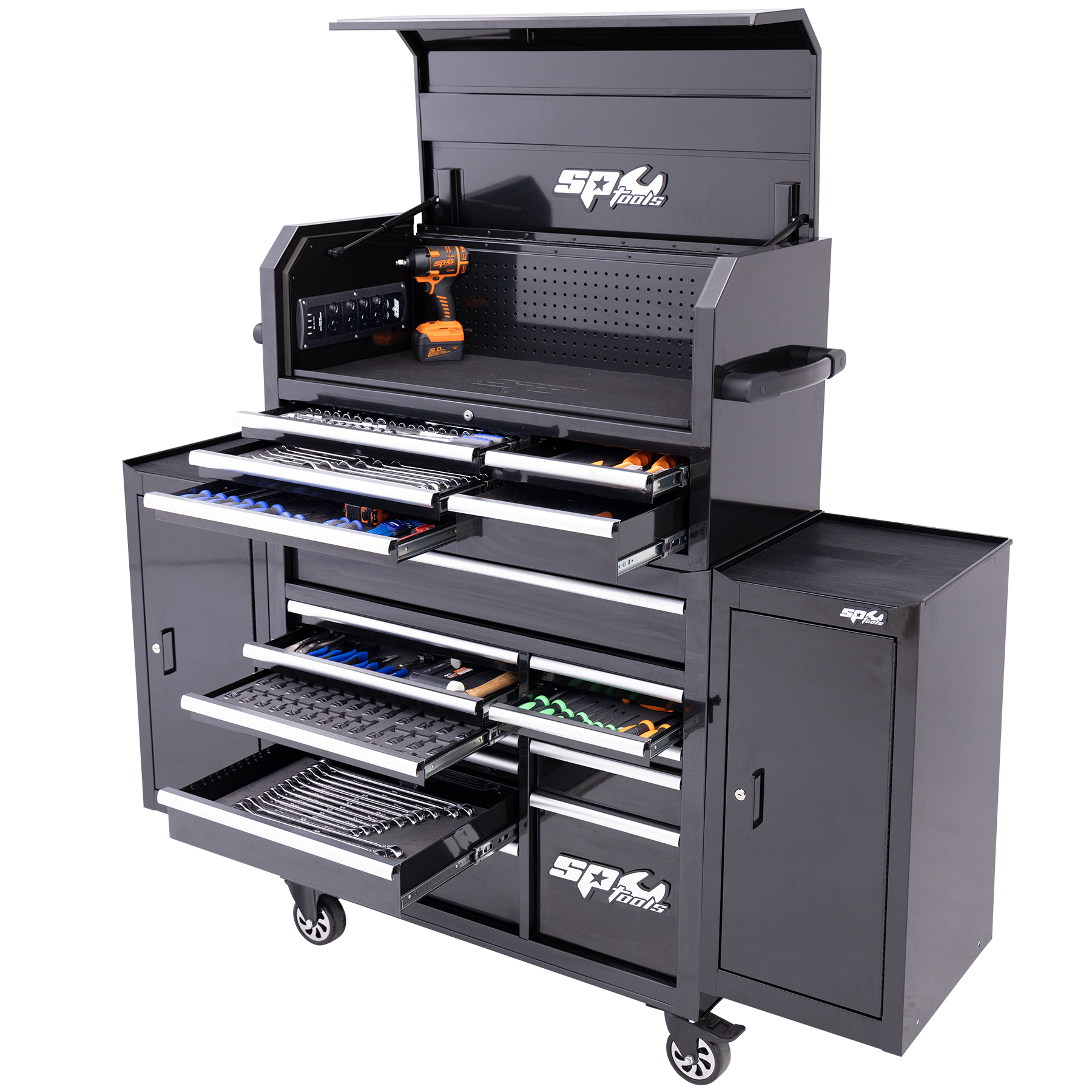 • 579Pc Metric/Sae Sumo Series Power Hutch Tool Kit With Dual Side Cabinets • 1/4 3/8 & 1/2"Dr Sockets & Accessories • Combination Geardrive Flare Nut Ring & E-Torx Spanner Sets • 18V 1/2""Dr Cordless Impact Wrench • 12V 3/8""Dr Cordless Mini Ratchet • Assorted Screwdrivers • Ratchet Driver Bit Set"