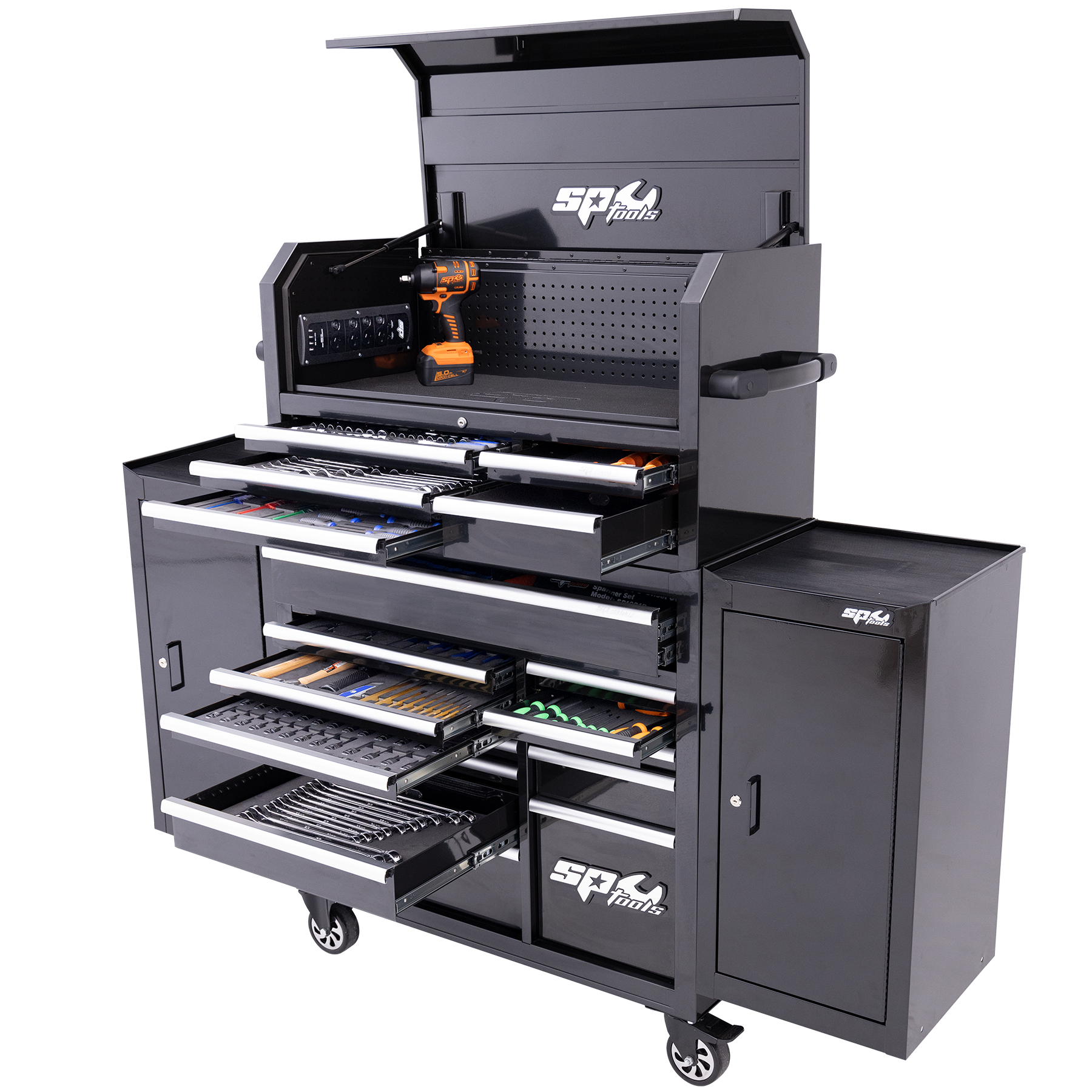 • 579Pc Metric/Sae Sumo Series Power Hutch Tool Kit With Dual Side Cabinets • 1/4 3/8 & 1/2"Dr Sockets & Accessories • Combination Geardrive Flare Nut Ring & E-Torx Spanner Sets • 18V 1/2""Dr Cordless Impact Wrench • 12V 3/8""Dr Cordless Mini Ratchet • Assorted Screwdrivers • Ratchet Driver Bit Set"