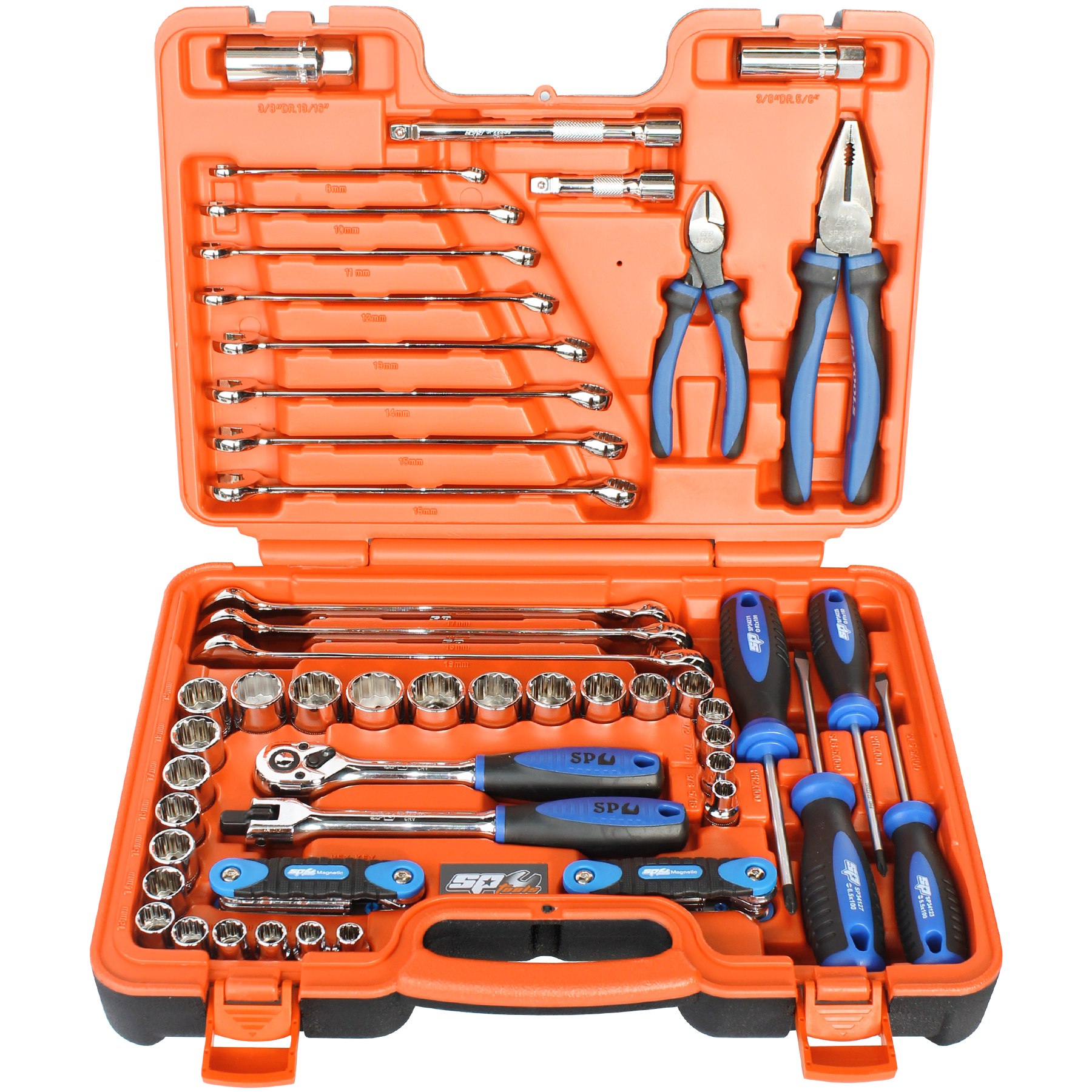 65Pc 3/8”D R Metric/Sae Tool Kit • 3/8” Dr Metric 8-19mm & Sae 5/16-7/8” Sockets • 3/8” Dr Ratchet, Flex Handle & Wobble Extension Bars • Diagonal Cutters • Combination Pliers • Magnetic Metric & Sae Hex Keys • Slotted & Phillips Screwdrivers