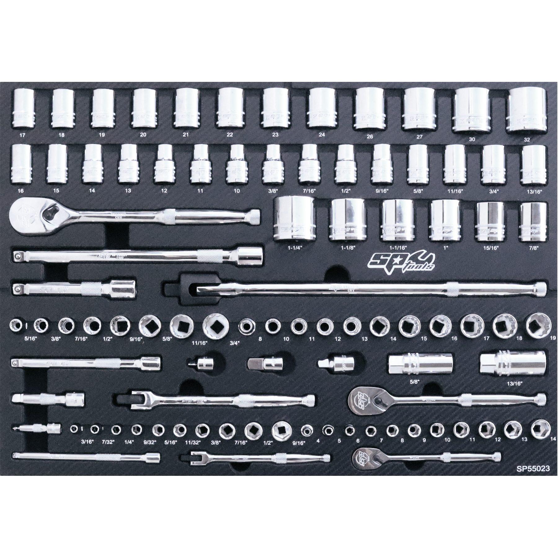 • 1/4”Dr Sockets & Accessories • 12Pt – 4 To 14mm • 12Pt - 3/16” To 9/16”• 90T Ratchet • Flex Handle • Universal Joint • Wobble Extension Bars • 3/8”Dr Sockets & Accessories • 12Pt – 6 To 22mm • 12Pt – 1/4” To 7/8” • Spark Plug Sockets • 90T Ratchet • Flex Handle • Universal Joint • Wobble Extension Bars • Adaptors • 1/2”Dr Sockets & Accessories • 12Pt – 10 To 32mm • 12Pt - 3/8” To 1-1/4” • 90T Ratchet • Flex Handle • Universal Joint • Wobble Extension Bars • Adaptors