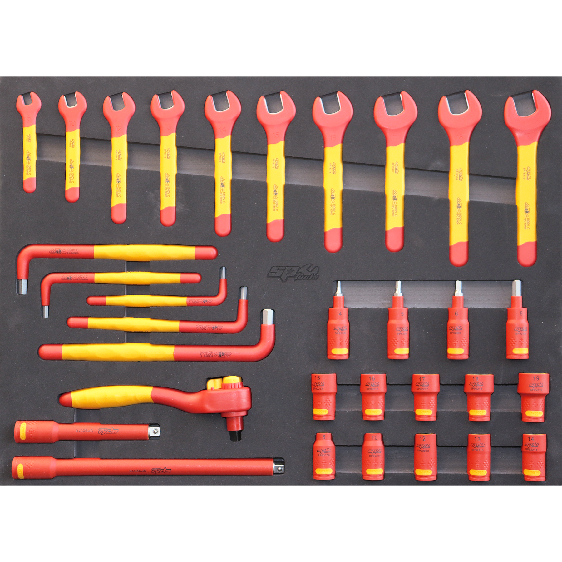 Vde Insulated Tool Kits In Eva Foam • Spanners • Sockets • Hex Keys • Hex Sockets • Ratchet & Extension Bar Kit • 10Pc Spanners Set - 8 10 12 13 14 15 17 18 & 19mm • 10Pc Socket Set - 8 10 12 13 14 15 16 17 18 & 19mm • 4Pc Hex Sockets - 4 5 6 & 8mm • 5Pc Hex Keys • Ratchet Driver • 2X Extension Bars