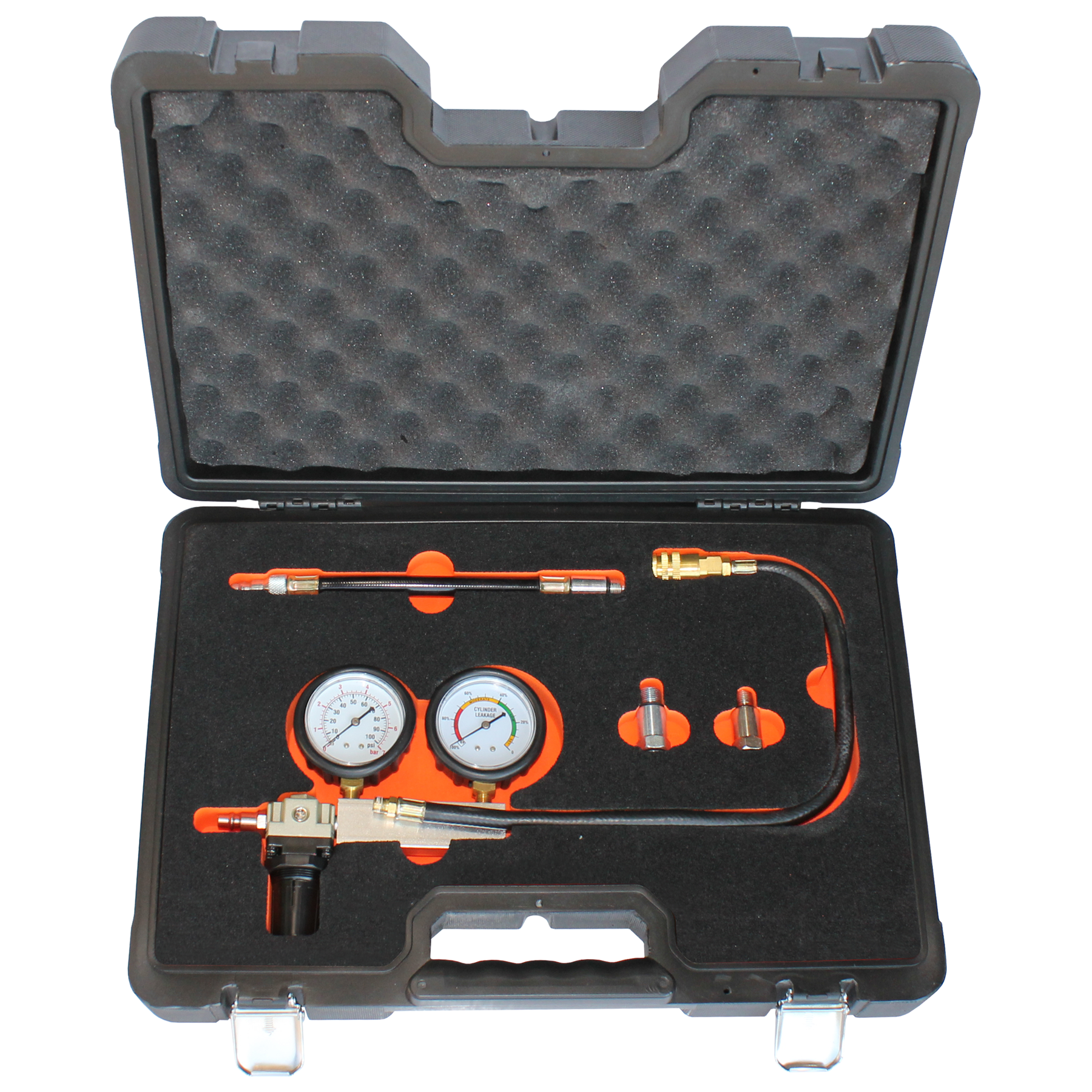 Cylinder Leak Detector & Crank Stopper • Pinpoints Low Compression Cause Ie Burnt Valves, Worn Rings, Etc • Crank Stopper Locks Engine In Place To Facilitate Installation Of Timing Belts & Removal Of Harmonic Balance Pulleys • Gauges Show % Of Cylinder Leakage & Cylinder Pressure • Suitable For Use On Any Petrol Engine With 14 Or 18mm Spark Plugs