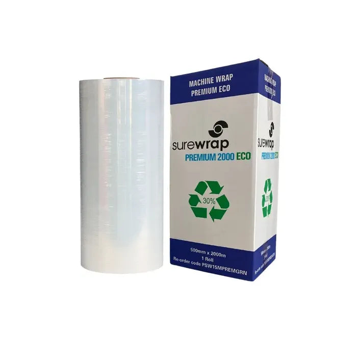 Surepak – Clear Machine Stretch Film Pallet Wrap Surewrap Premium 2000 Eco 30% Recycled 500mm x 2000m 15um ROLL | PSW15MPREMGRN