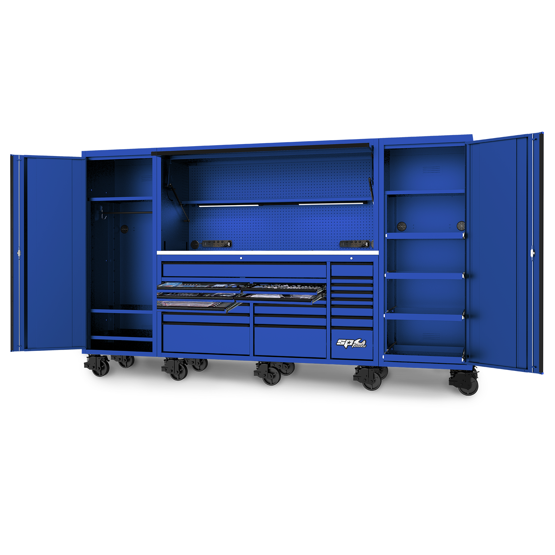 SP Tools - Toolkit 1017pc Metric/Sae - Usa Sumo Series 128" Roller Cabinet With Power Top Hutch And Side Cabinets 21 Drawer Blue | SP50855BL