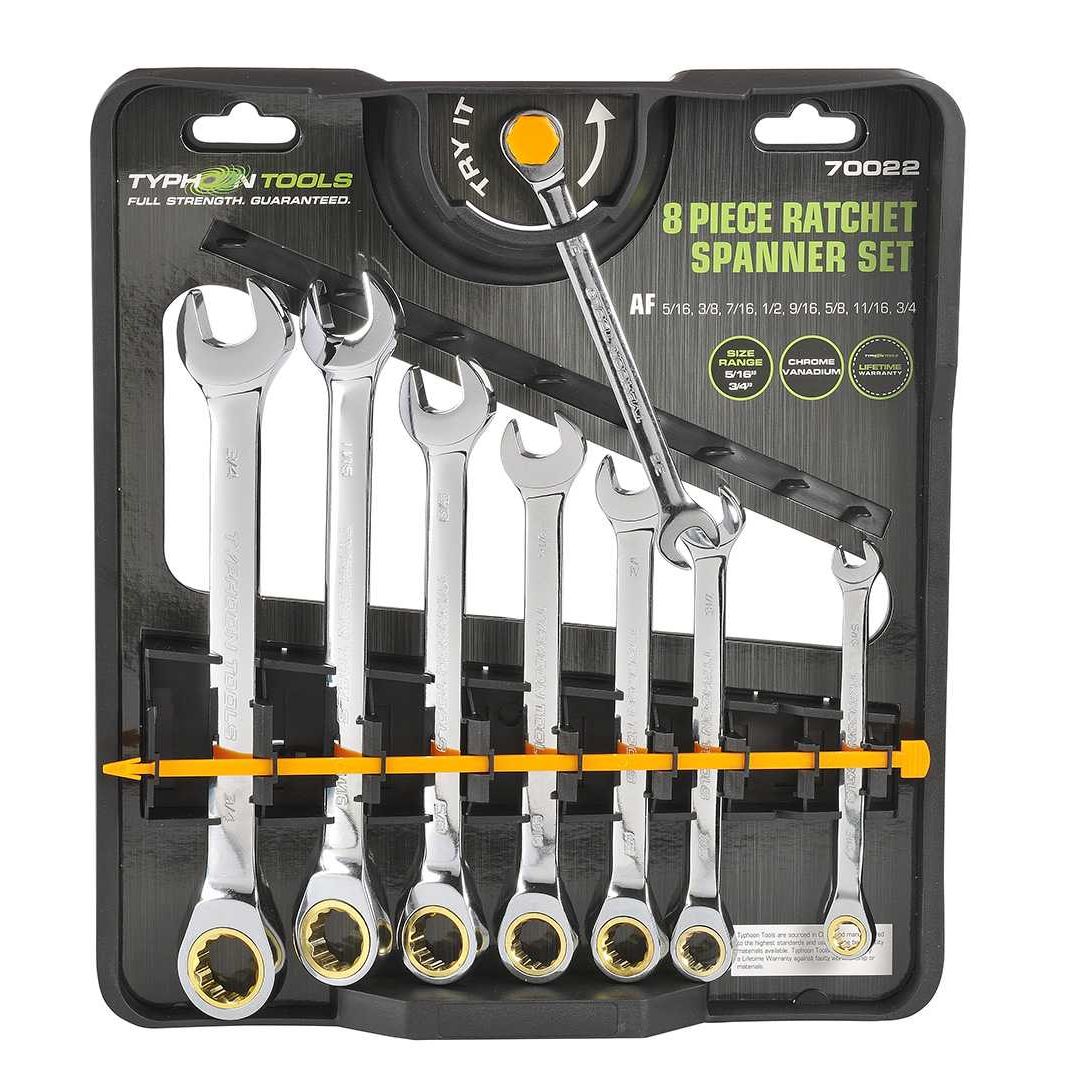 Introducing the Typhoon Tools - 8 pce Ratchet Spanner Set Af, your ultimate solution for efficient and precise fastening in automotive and mechanical tasks. This comprehensive toolset is designed to provide you with the versatility and convenience you need for various applications, making it a must-have for both DIY enthusiasts and professional mechanics.