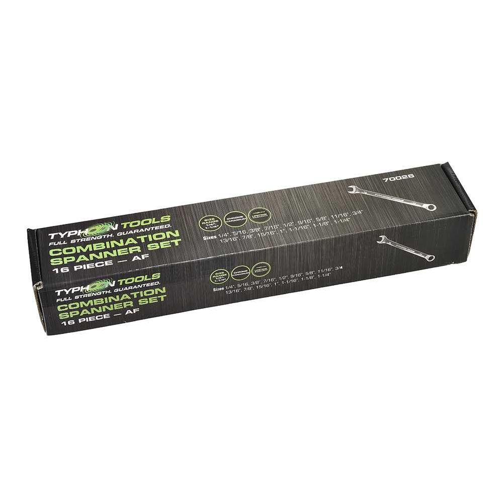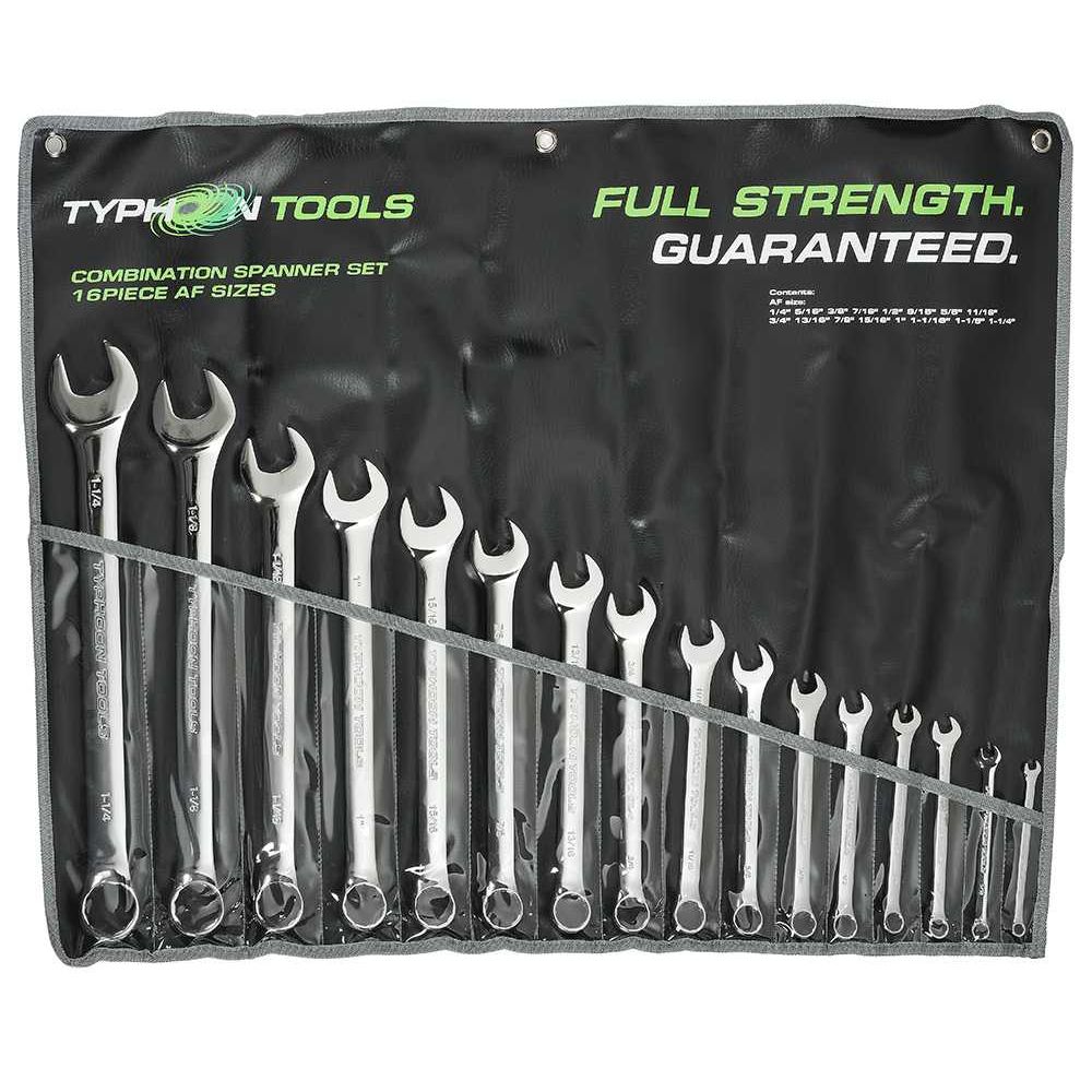 Introducing the 16 pce Spanner Set Af 1/4"- 1 1/4" by Typhoon Tools, your ultimate solution for achieving precision and efficiency in your automotive and mechanical tasks. This comprehensive spanner set is designed for both professionals and DIY enthusiasts who demand quality and versatility in their toolkit.